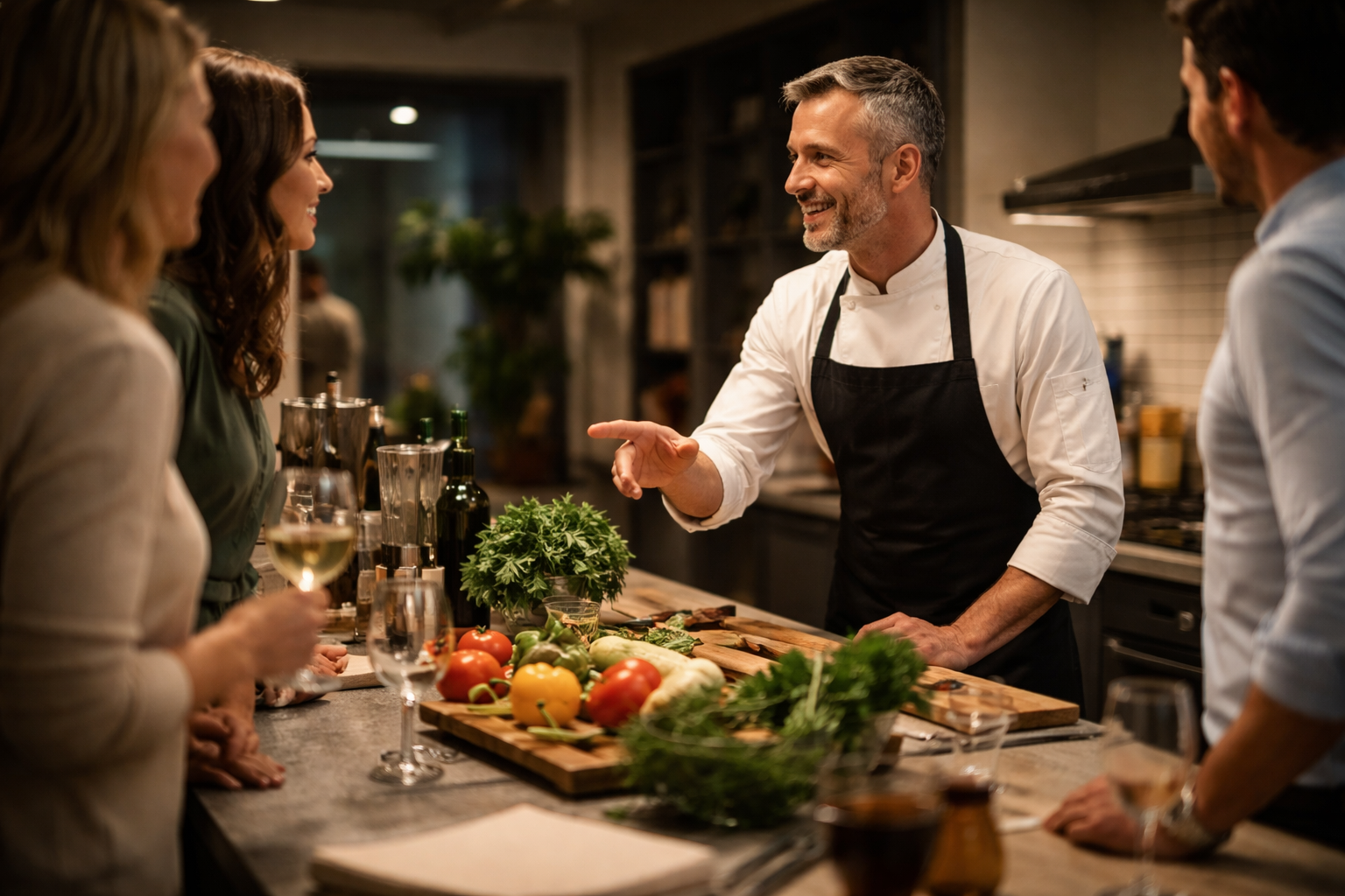 • Sie kochen nicht nur, sondern begleiten Gäste durch den Abend, moderieren, erklären und schaffen eine angenehme, entspannte Atmosphäre